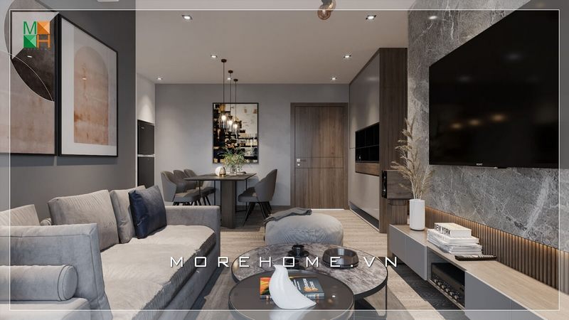 Bố trí sofa hiện đại kiểu dáng văng tiện lợi với tone xám tinh tế phù hợp với không gian phòng khách căn hộ chung cư