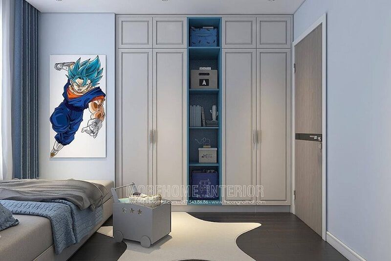 Mẫu thiết kế tủ quần áo đẹp màu trắng kết hợp kệ tủ không cánh màu xanh tạo điểm nhấn nổi biệt cho không gian căn phòng