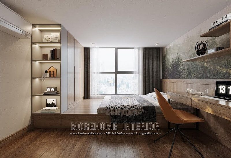 Thiết kế kệ tủ quần áo âm tường cũng góp phần lớn tiết kiệm không gian cho căn phòng