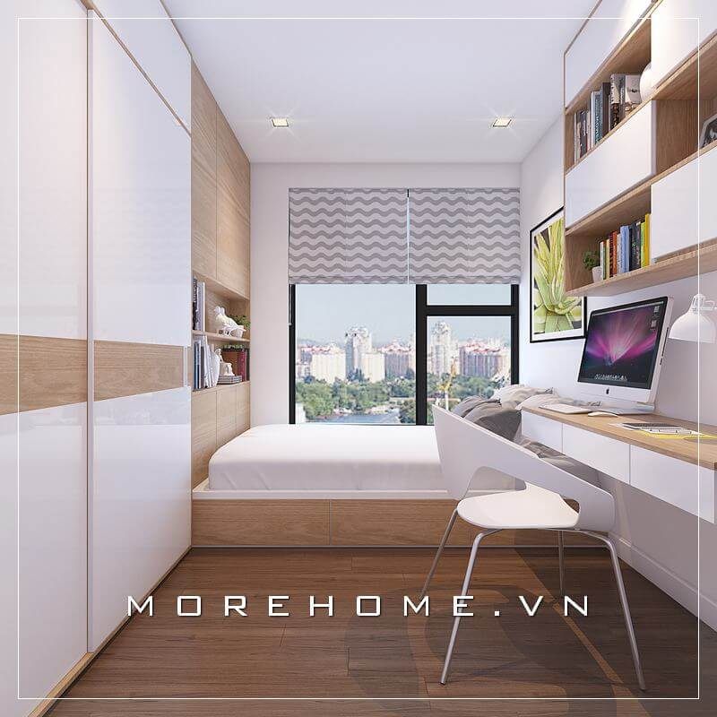 Nội thất phòng ngủ chung cư hiện đại, bàn học nối liền tap đầu giường cùng tone màu tạo nên sự liền mạch cho cả không gian phòng ngủ