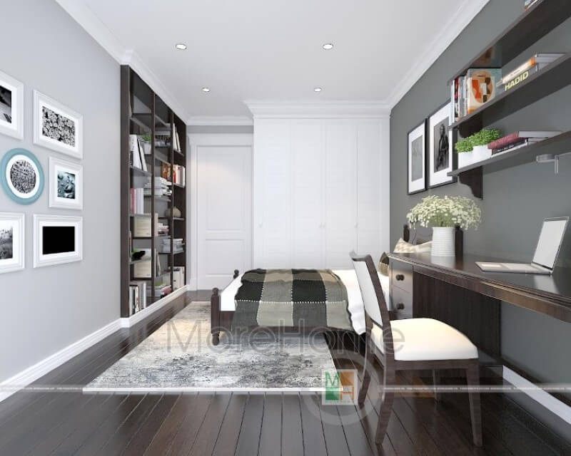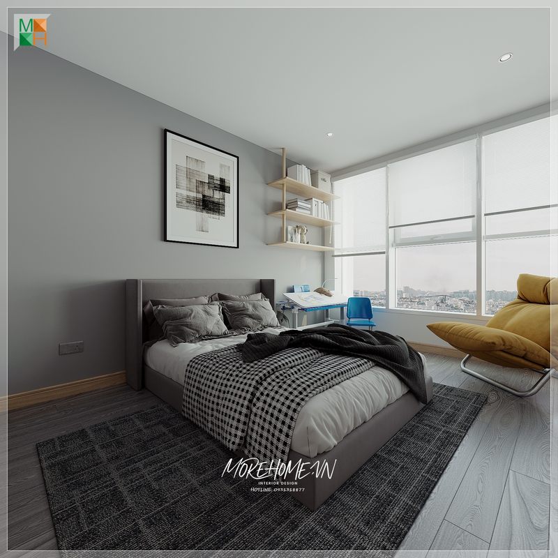 Giường ngủ màu xam hợp với tone màu của căn phòng vì vậy bạn sẽ có cảm giác dễ chịu thoải mái khi bước chân vào phòng.