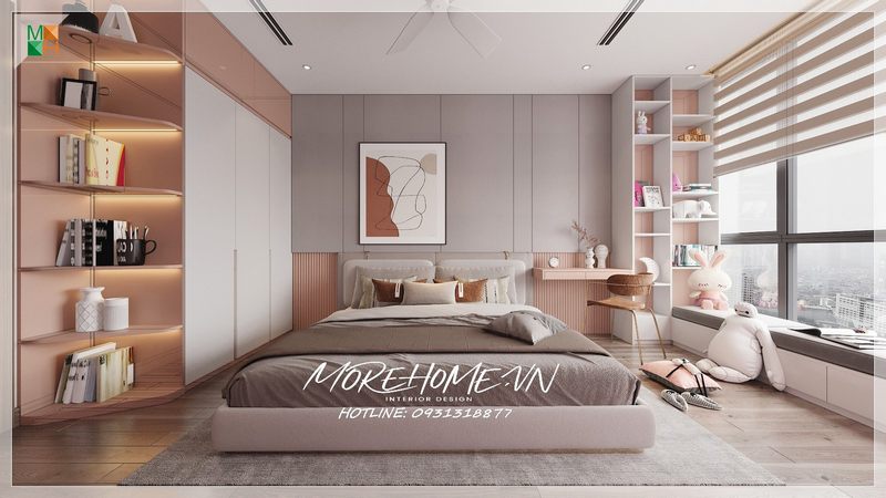 Mẫu thiết kế giường ngủ 2 tầng hiện đại, công năng rất tiện lợi cho bé. Sử dụng 2 tone màu chủ đạo là hồng và trắng rất dễ thương.
