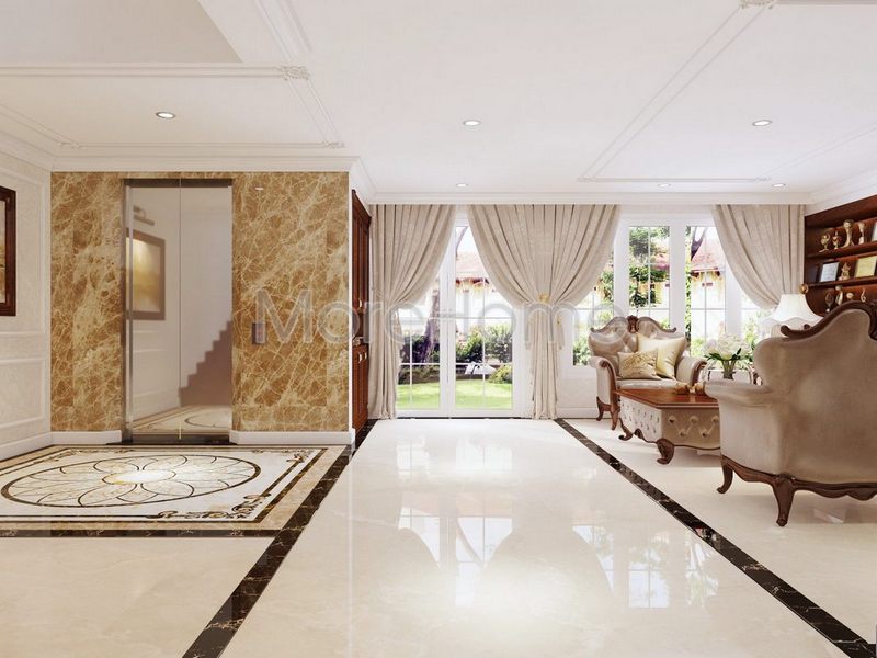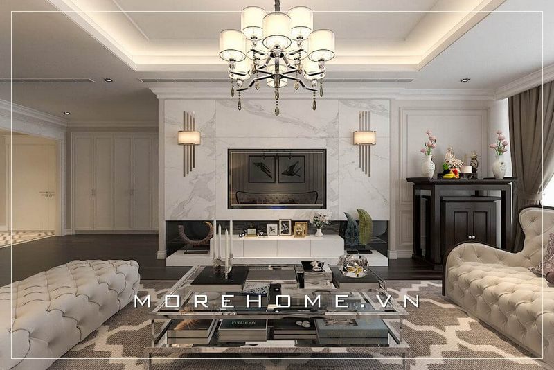 Trang trí nội thất phòng khách biệt thự tân cổ điển nhẹ nhàng, không quá cầu kì vào từng chi tiết nhỏ, tạo nên không gian sang chảnh và thoáng đãng hơn