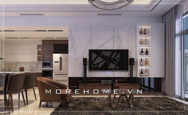 Phòng khách với phong cách căn hộ hiện đại là 1 xu hướng được nhiều người hướng tới. Được thi công hoàn thiện từ bản vẽ thiết kế của các kiến trúc sư Morehome với sự sắp đặt này không gian phòng khách vừa đầy đủ để đảm bảo việc tiếp khách nhưng cũng mang tính thẩm mĩ cao.