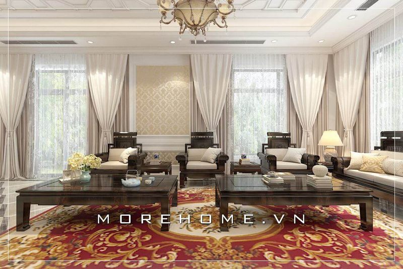 Thiết kế nội thất phòng khách phong cách gỗ Việt sang trọng, ấm cúng thể hiện đẳng cấp của gia chủ