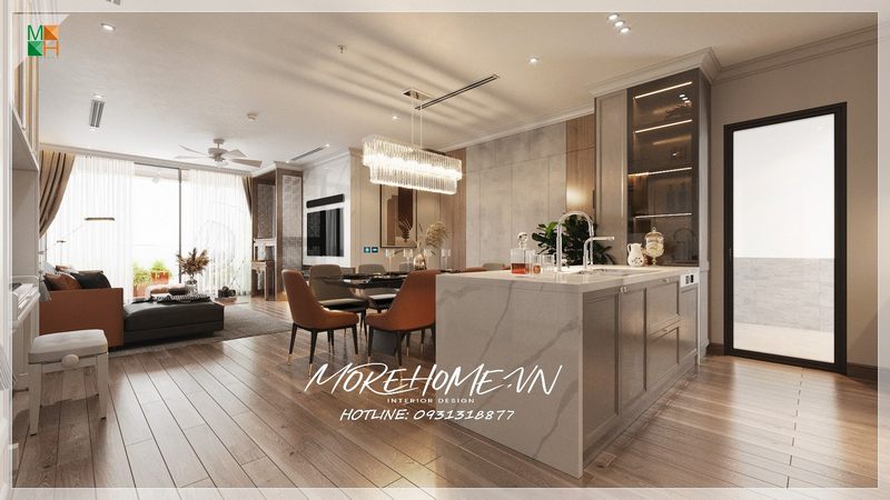 Mẫu thiết kế phòng khách liền kề bếp tân cổ điển và được ngăn cách bởi bộ bàn ăn đang được nhiều gia chủ ưa chuộng và sử dụng cho không gian sinh hoạt chung tiện nghi hơn.