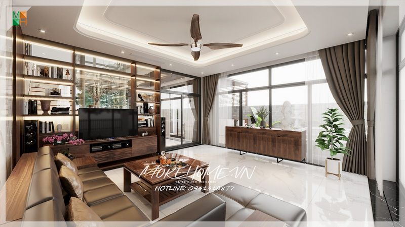 Ấn tượng với mẫu thiết kế phòng khách biệt thự gỗ óc chó hiện đại sang trọng tinh tế và đẳng cấp.
